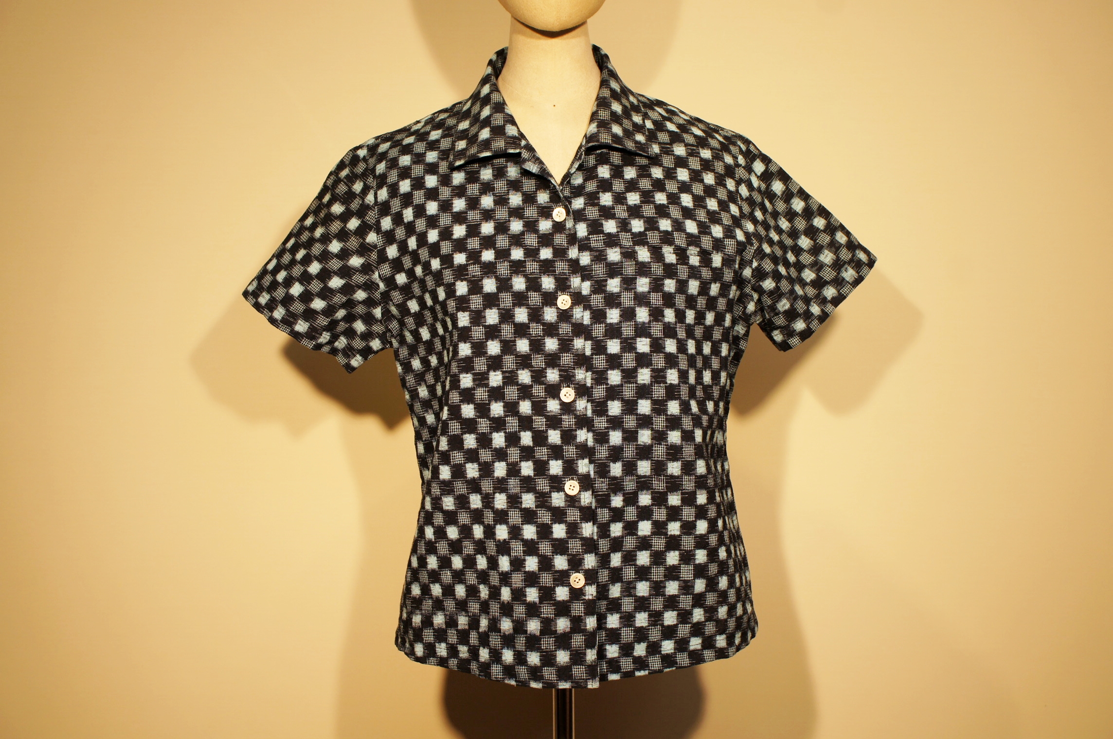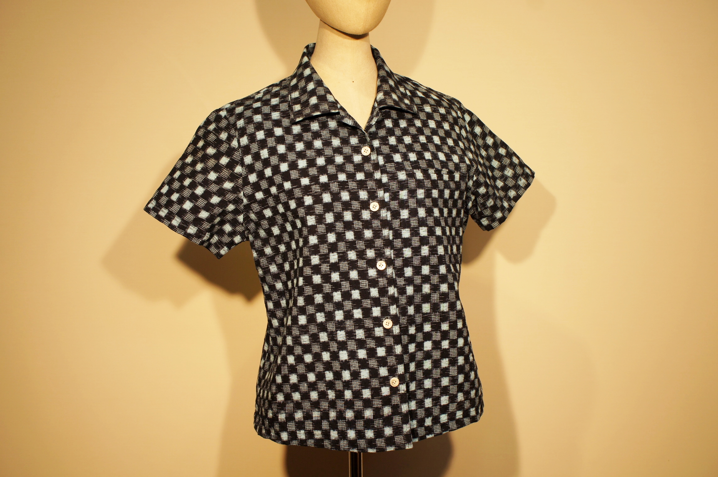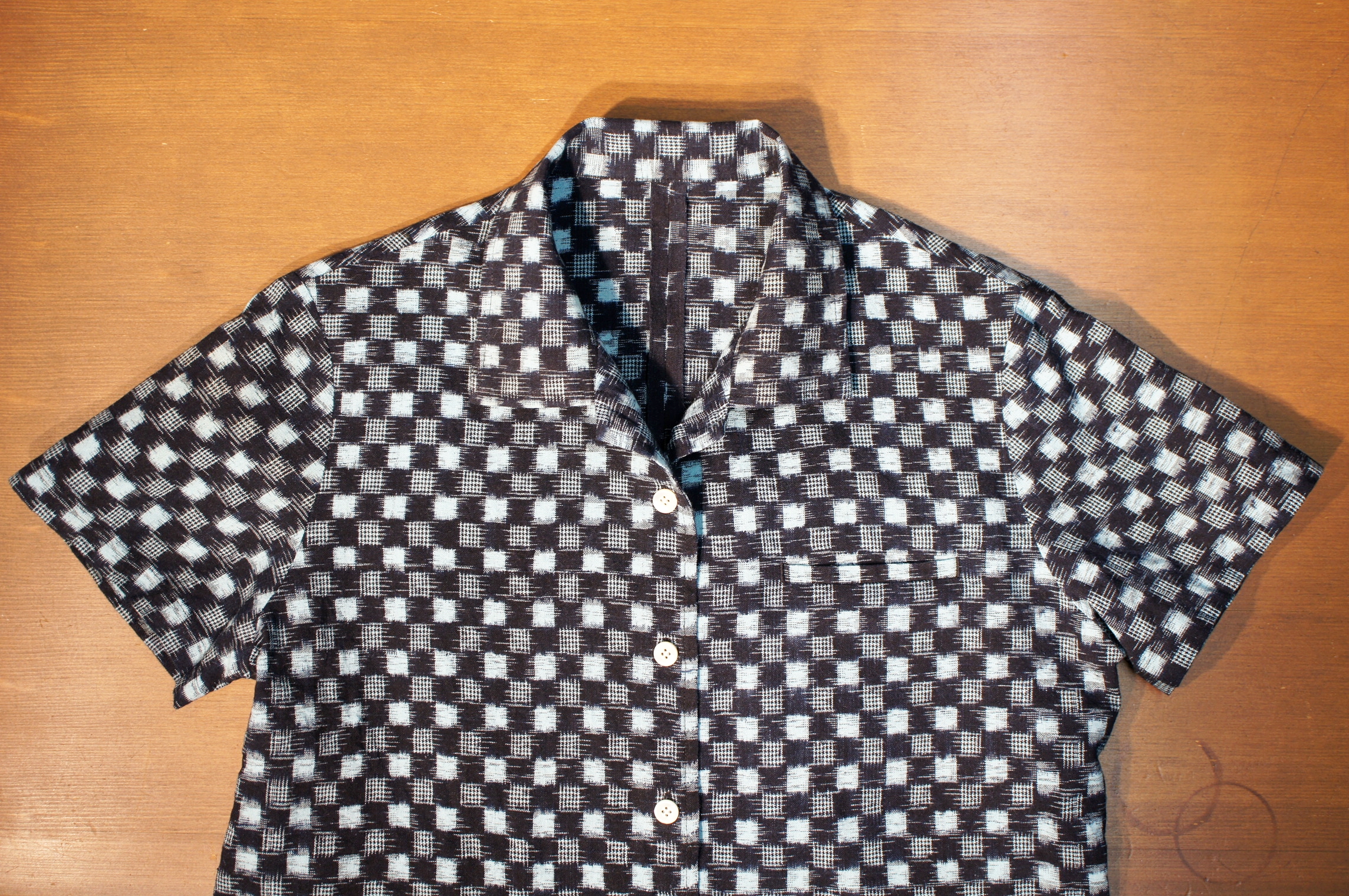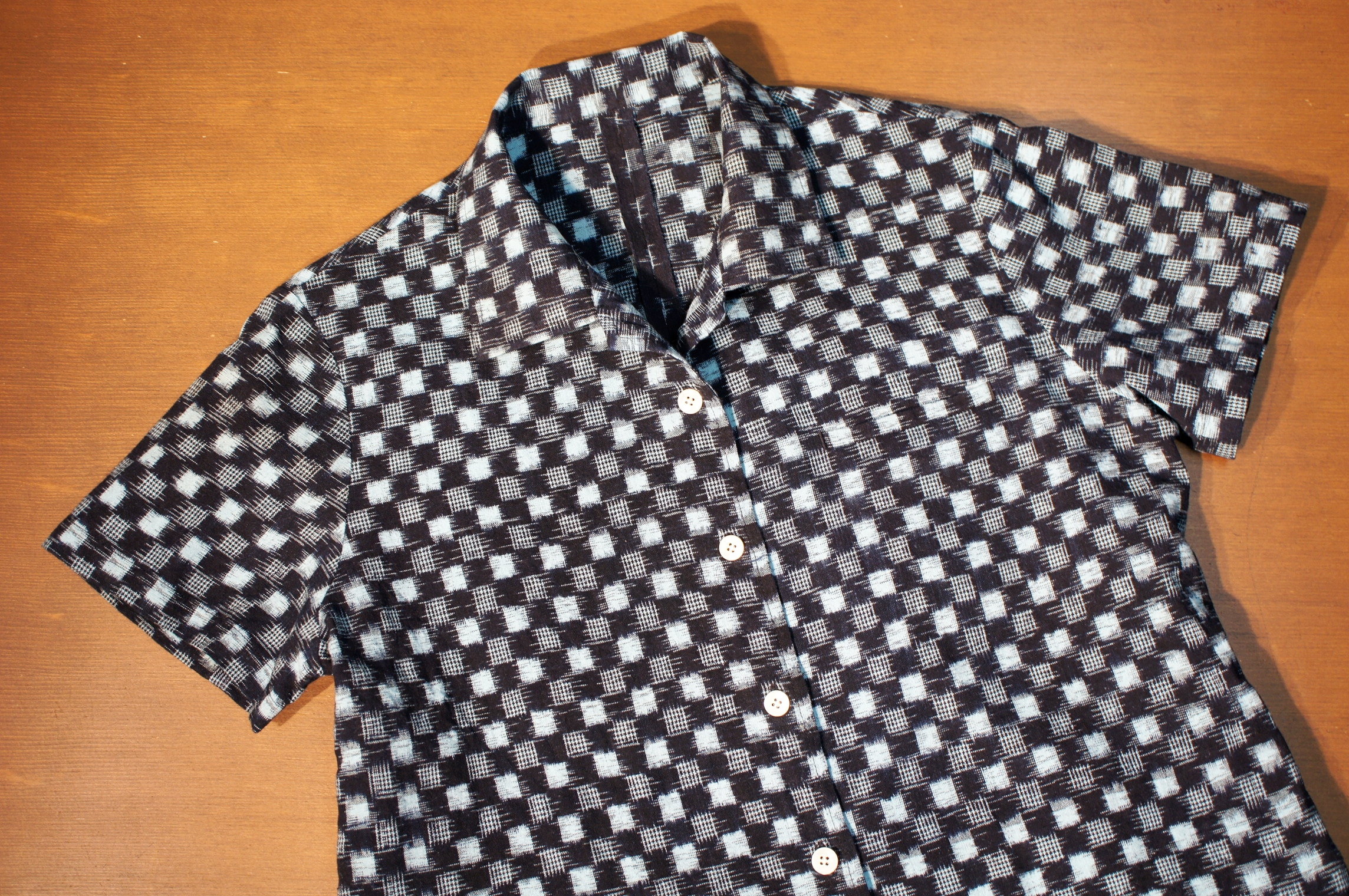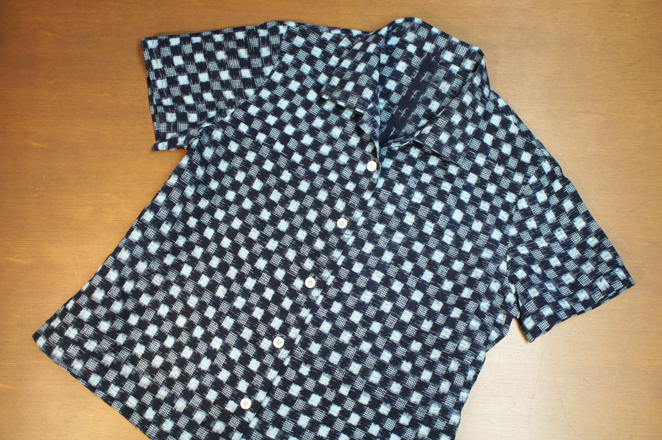 市松柄の絣からアロハシャツを作製しました。 絣の由来でもあるかすれた柄が十分にお楽しみ頂けるのではないかと思います。