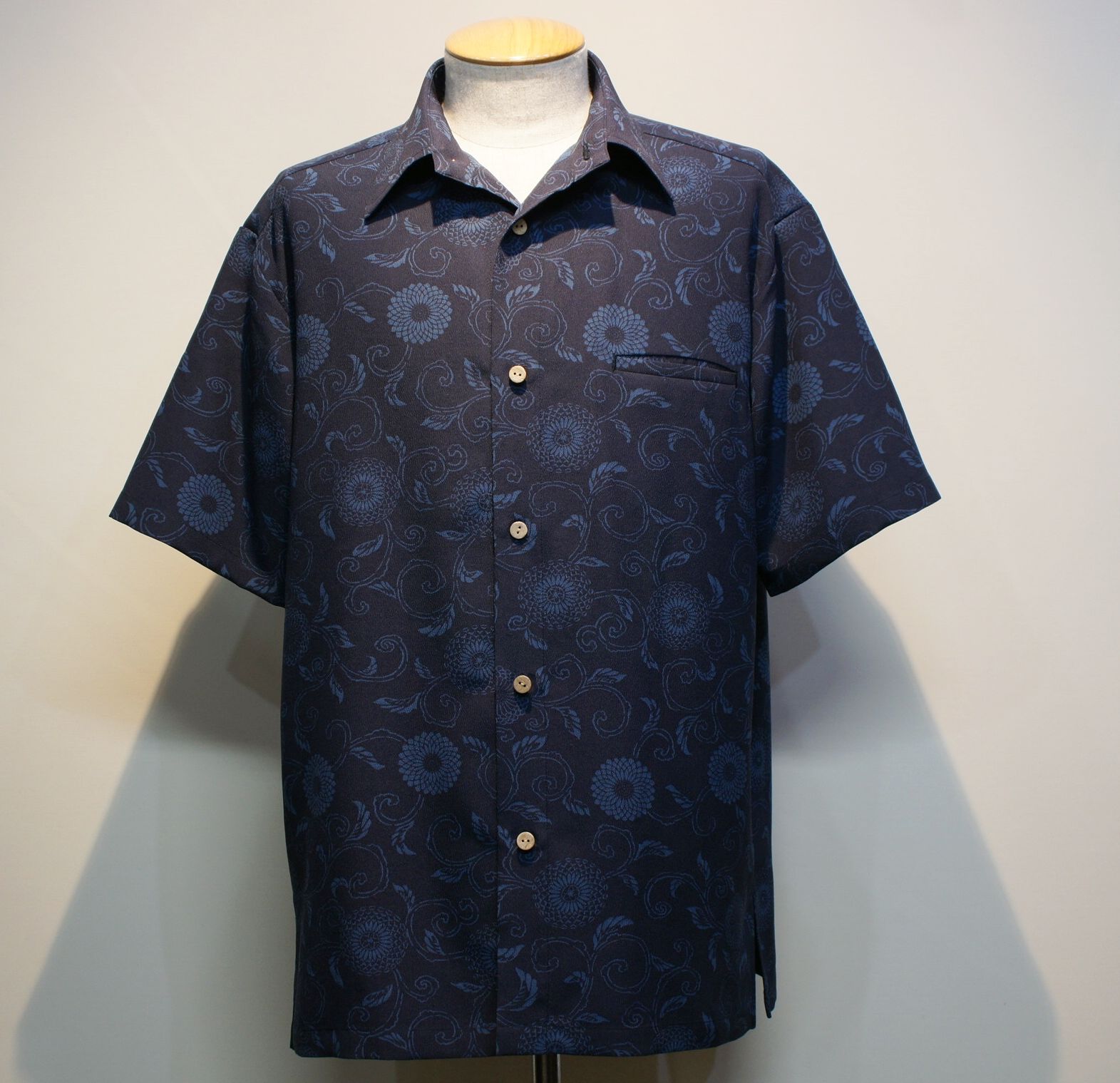 本藍型染め アロハシャツ [菊唐草文/小紋] M