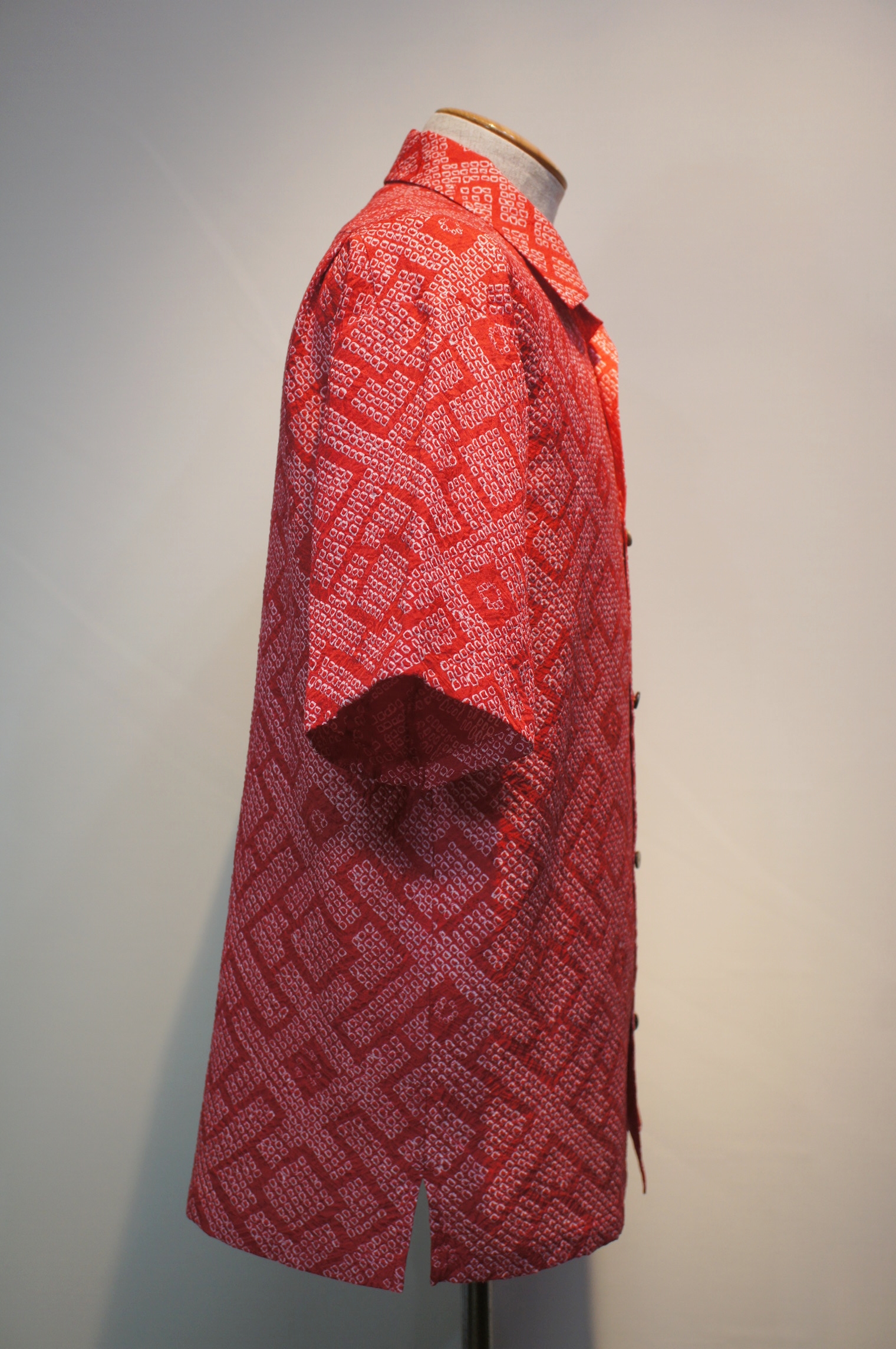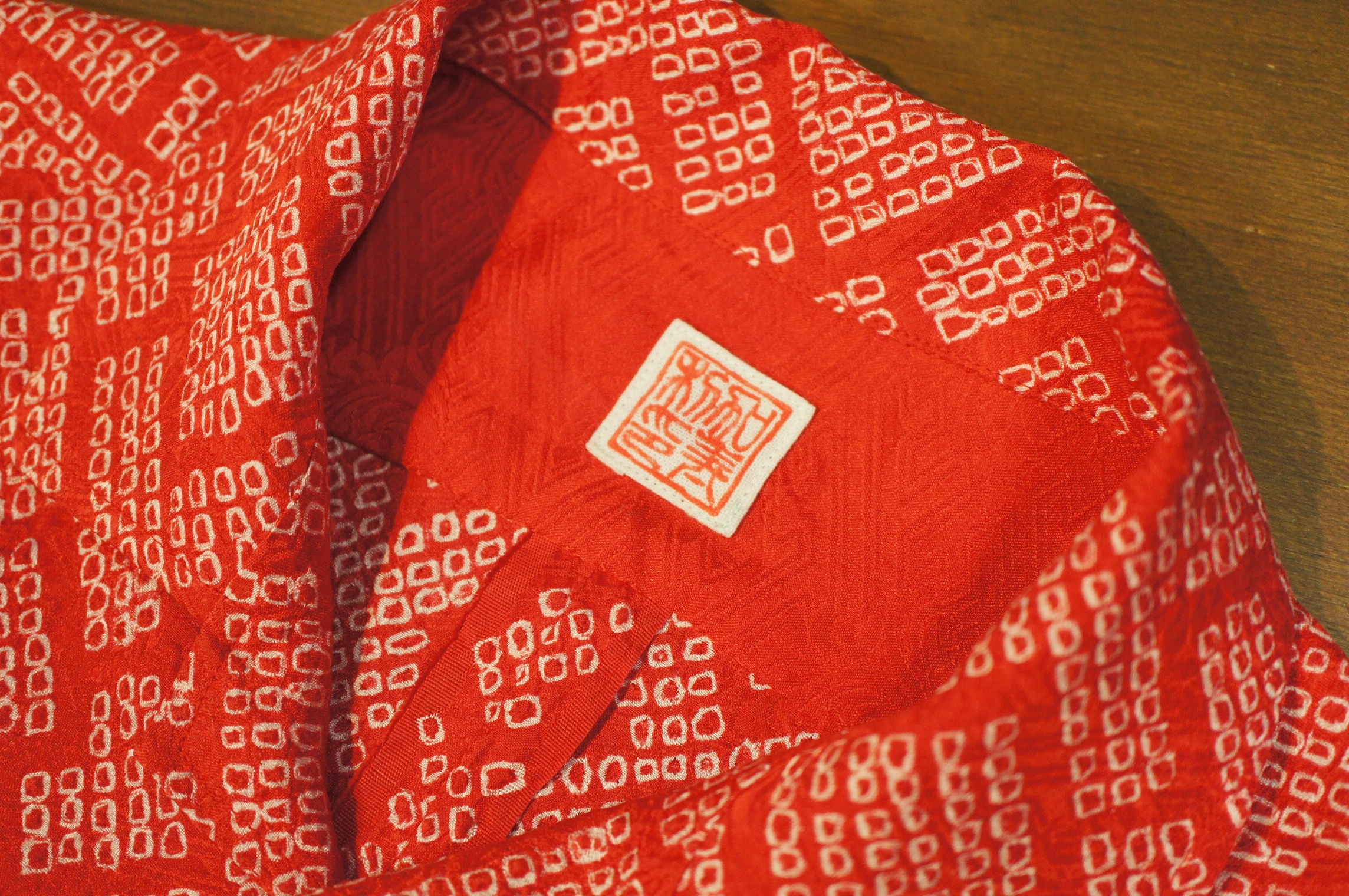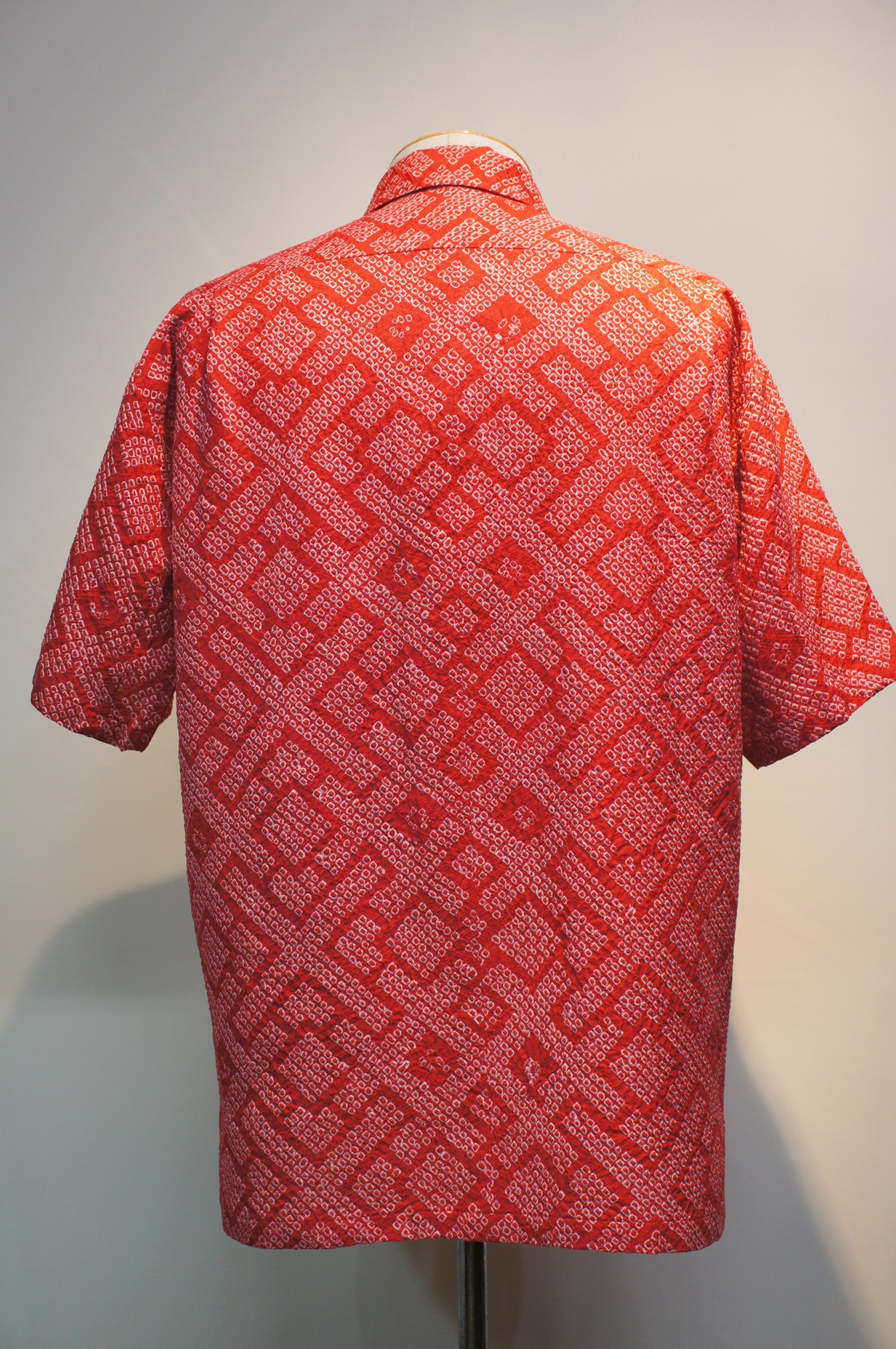 総絞り染めの生地を使用しており、ひと粒一粒の柄が手作業によるもので、膨大な時間と手間をかけて糸を巻き、染め上げられた生地です。