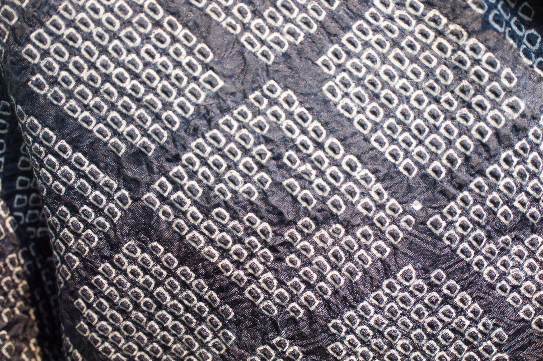 総絞り染めの生地を使用しており、ひと粒一粒の柄が手作業によるもので、膨大な時間と手間をかけて糸を巻き、染め上げられた生地です。